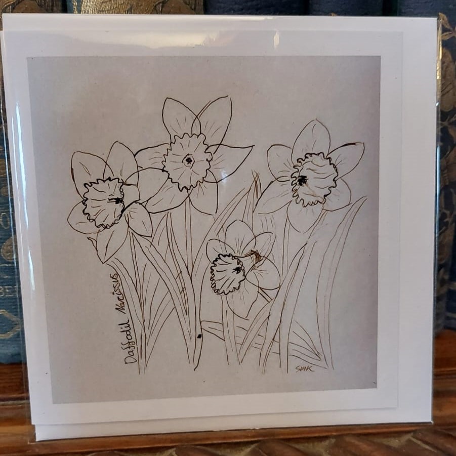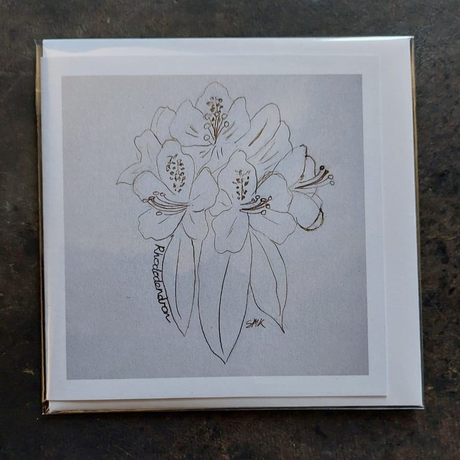 A selection of four cards featuring poisonous flowers in homemade botanical ink. Blank inside so you can write your own message. Printed in Cornwall each with it own envelope Rhododendron Periwinkle Hellebore Daffodil All Drawn in Oak gall ink Card 12cm square in a 13.5cm envelope